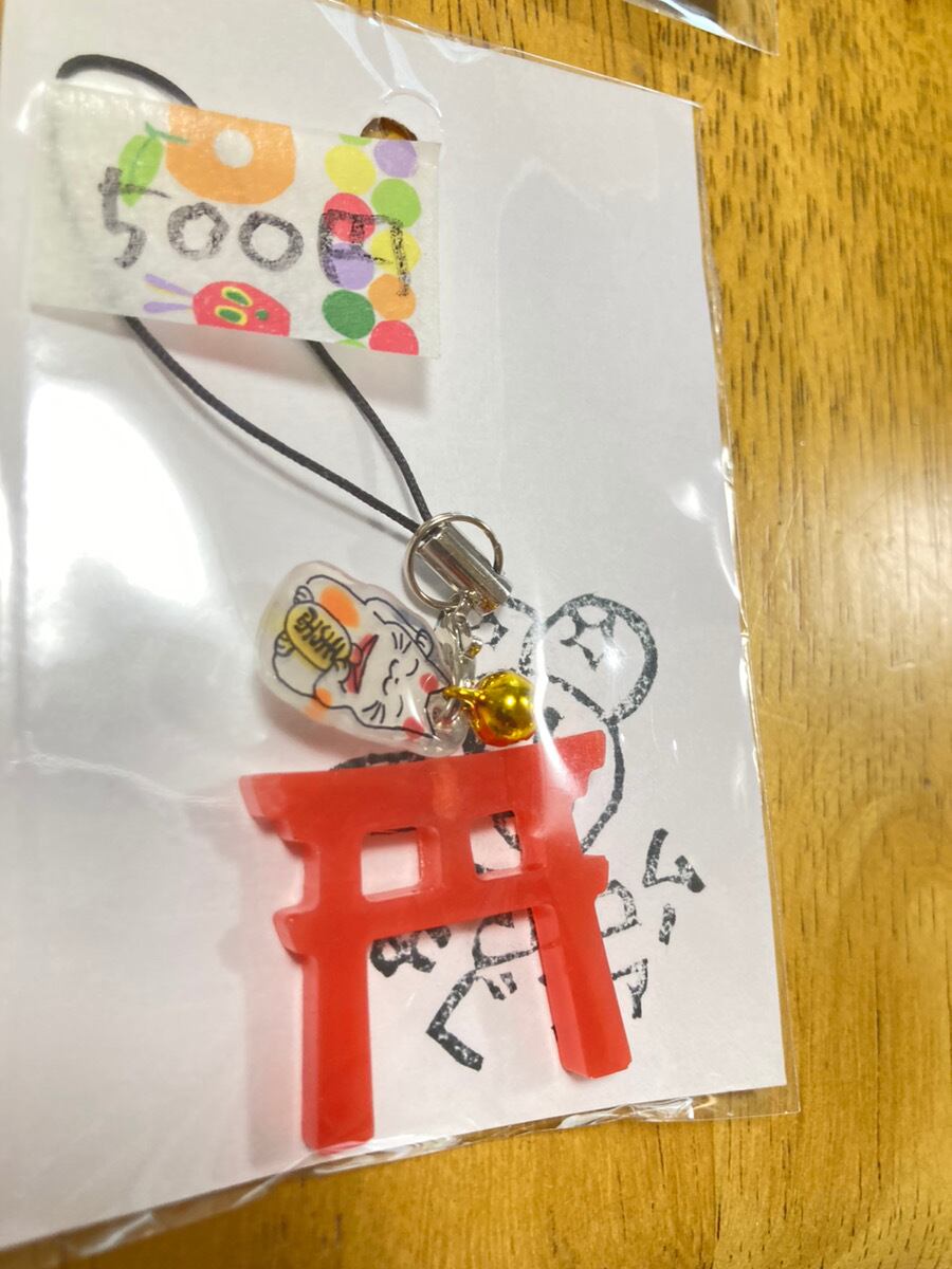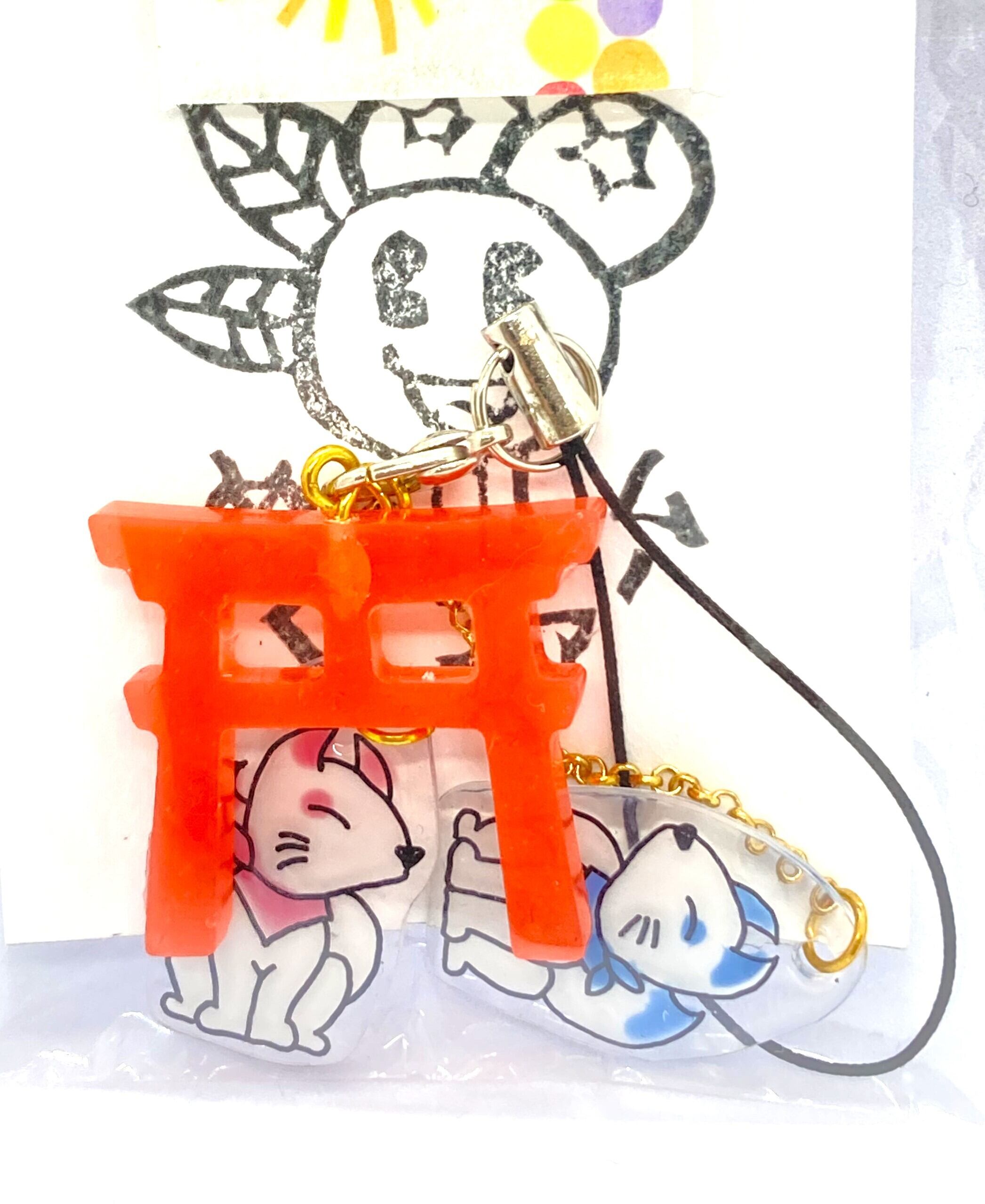 レジンで作成した鳥居のチャームに、プラバンとレジンで作成した招き猫がちょこんとついています。