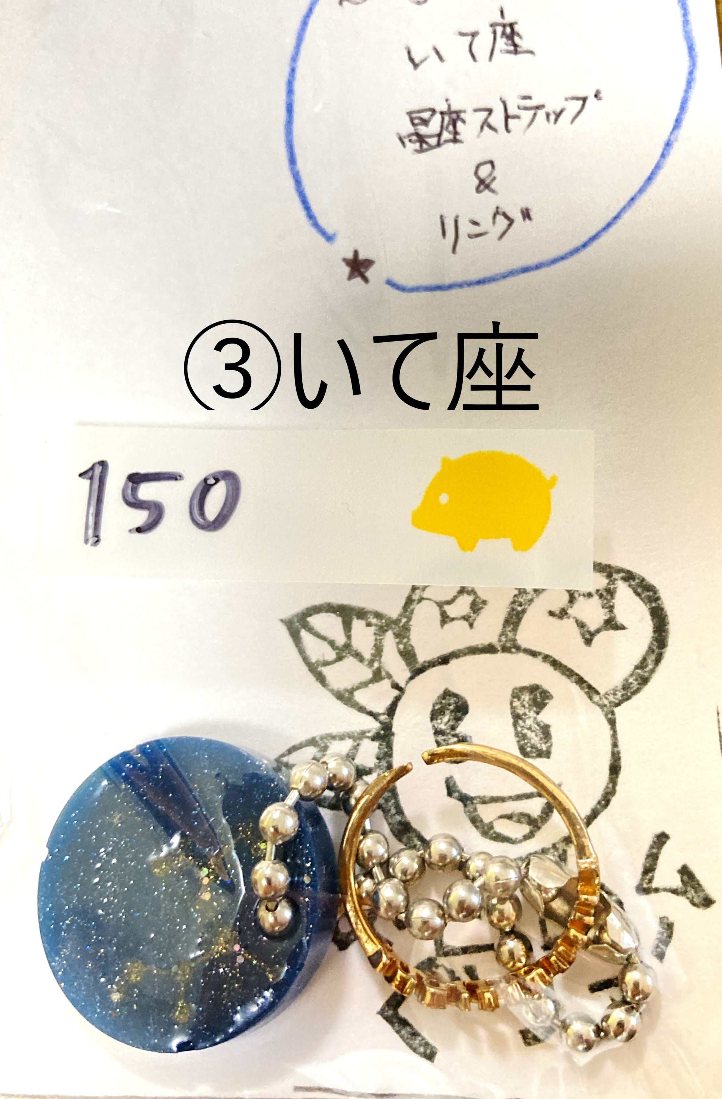 サイズ調整可能な指輪(各星座の英語筆記体表記)とレジンで作成したチャームのセット。